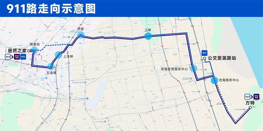 363路(居然之家-方特)調整后的911路首末站為“居然之家-公交聚英路站”,911路高峰車為“居然之家-方特”。