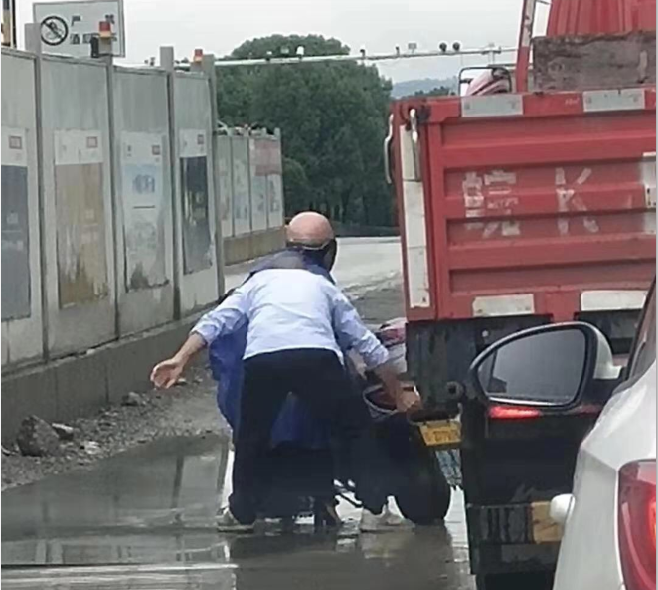 據尤再兵本人回憶說,7月10號下午15:10分左右,他駕駛車輛行駛至財富大道路段,該路段由于正在施工,地勢低洼,路面積水比較嚴重,一名駕駛電動車的女士不慎被臨時鋪設在路面的鋼板刮倒在地。由于穿著雨披,再加上路面濕滑,騎電動車的女士怎么也扶不起車子,情急之下,他將車輛靠邊停好,冒雨下車幫忙扶起電動車并推到路旁,再三確認女士沒有受傷后,這才放心回到車上,繼續投入工作。
